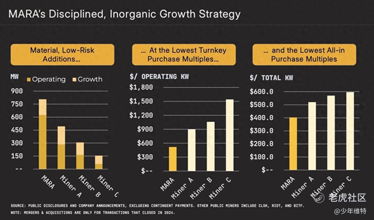 这种模式有好有坏,优势是能够以较低的前期投入快速上线并开始盈利,这个我之前文章友分析过,能快速产生收入,在比特币等加密货币价格上涨的大周期中,股本ROE会更高。而像MARA这种,通常会承担更大的资本压力,重资产,要承担相应的基础设施和运营成本,虽然MARA算是行业里把支出做到了较低的水平。