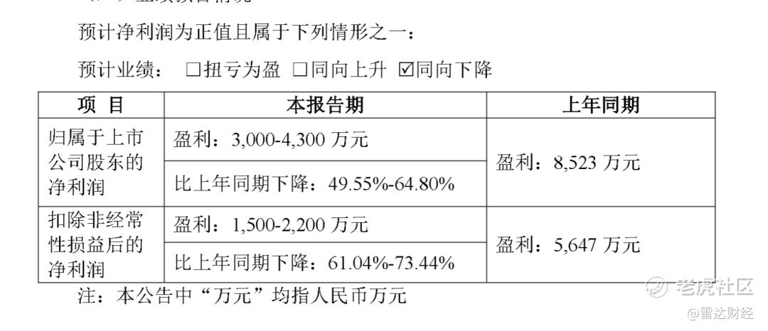 公告显示,本报告期归属于上市公司股东的净利润盈利:3000-4300万元,比上年同期下降:49.55%-64.8%;上年同期归属于上市公司股东的净利润盈利8523万元。本报告期扣除非经常性损益后的净利润盈利:1500-2200万元,比上年同期下降:61.04%-73.44%;上年同期扣除非经常性损益后的净利润盈利:5647万元。
