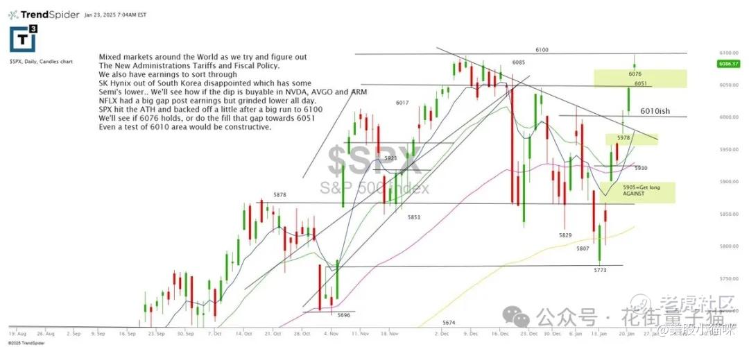 全球市场走势波动,我们尝试弄清新政府的关税和财政政策。同时需要整理企业财报。韩国 SK 海力士的表现令人失望,令部分半导体股下跌。我们将观察 NVDA、AVGO 和 ARM 是否在低点可买入。NFLX 在发布财报后出现大幅缺口,但全天走势较低。SPX 创下历史新高后略有回调,6100 点附近形成压力。我们将观察 6076 点能否维持,或者是否会回补至 6051 点附近,甚至测试 6010 点区域,这将是建设性的。