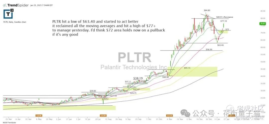 PLTR 跌至 $63.40 后开始表现得更好。它重新收复了所有移动平均线,昨天达到了 $77+ 的高点来管理。我认为现在 $72 区域在回调中能守住,如果它有任何好的表现。