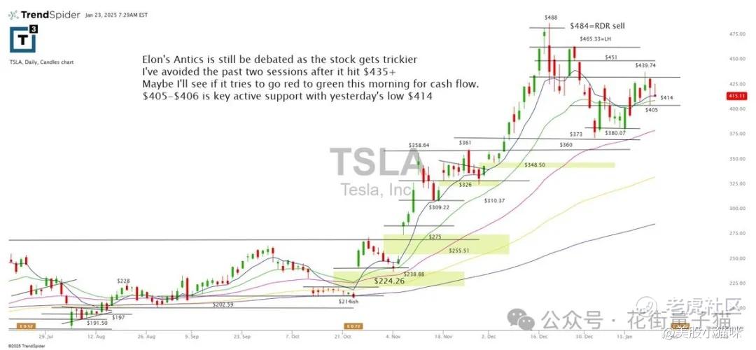 Elon 的行为仍然备受争议,使得特斯拉的股票走势更加复杂。我在其突破 $435 后避开了过去两天的交易。也许今天早晨我会观察其从红转绿的走势,寻求现金流。$405-$406 是昨天低点 $414 的关键支撑区域。