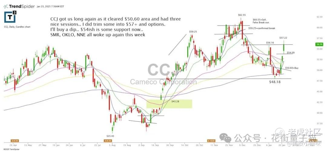 CCJ 再次突破 $50.60 区域并持有多头头寸,经历了三天的强势表现。我在 $57+ 以及期权中减持了一些。我现在会考虑在 $54 附近买入,该区域具有一定支撑。SMR、OKLO 和 NNE 本周也有显著表现。