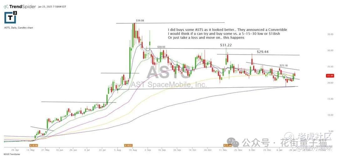 我买入了一些 ASTS,因为其表现有所改善。他们宣布了一笔可转债。我认为你可以尝试在接近 $18 区域时,或利用 5-15-30 分钟低点买入,或者直接认赔离场,这种情况是会发生的。