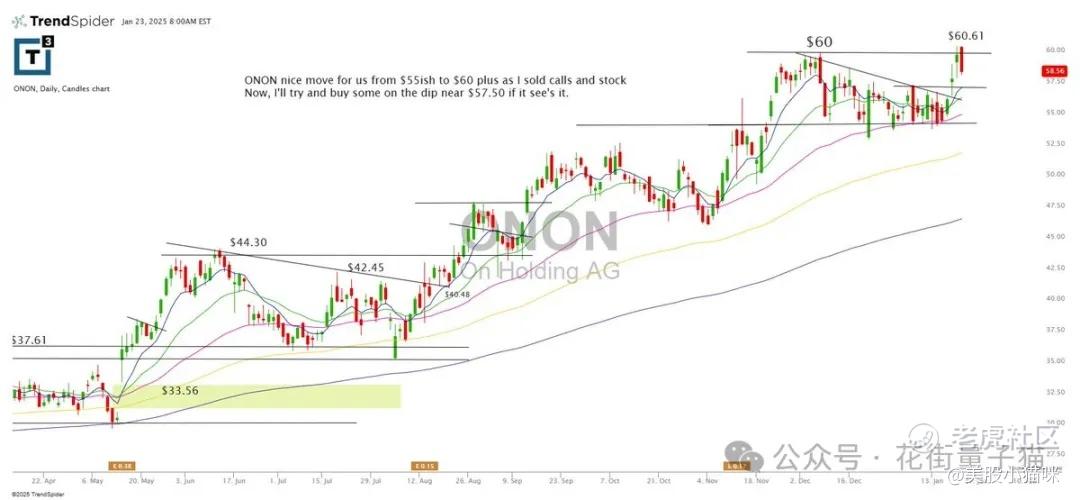 ONON 从约 $55 涨至 $60+,因为我卖出了看涨期权和股票。现在,我会尝试在接近 $57.50 的回调位置买入一些,如果有机会的话。