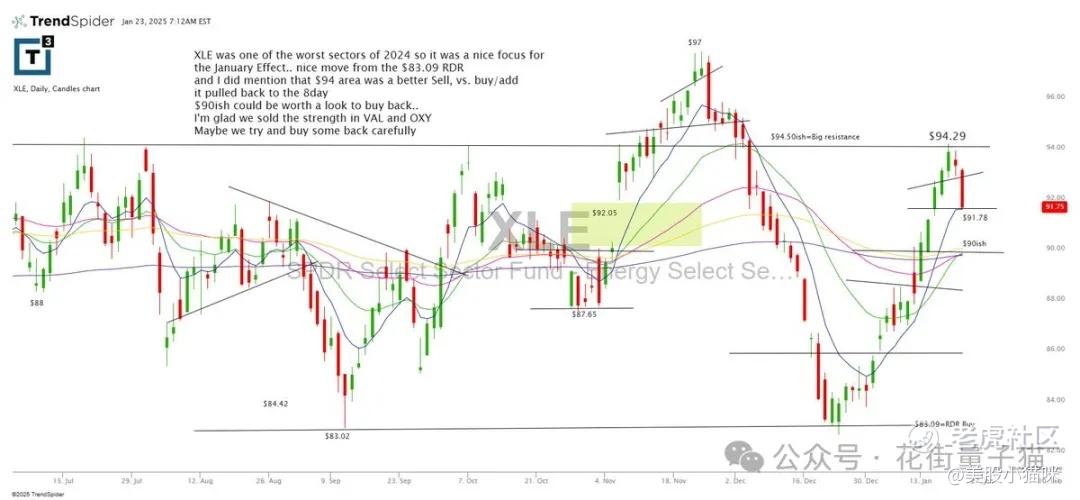 XLE 是 2024 年表现最差的板块之一,因此在 2025 年 1 月效果显著。从 $83.09 RDR 开始的良好表现,攀升至 $94 区域,我提到 $94 区域是更适合卖出的地方,而非买入/加仓。当价格回撤至 8 日均线时,$90 区域可能值得关注以重新买入。很高兴我们在 VAL 和 OXY 的强势中抛售了一部分,也许我们可以谨慎地回补部分仓位。