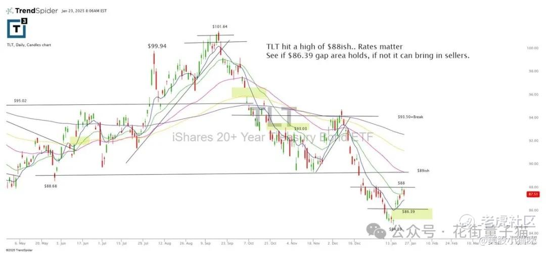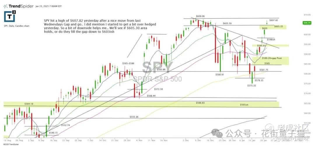 SPY 昨日从上周三的缺口和上涨中获得良好表现,触及 $607.82 的高点。我提到自己昨日稍微对冲了一些,适度的回调有助于我观察。我们将看 $605.30 区域能否维持,或者是否会回补至 $603 附近。