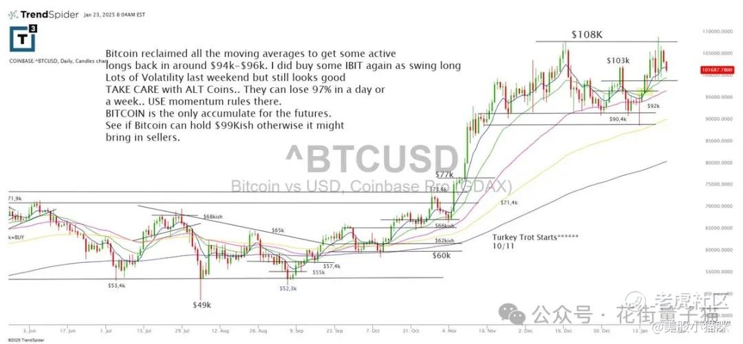 比特币收复了所有移动均线并在 $94k-$96k 区间获得了一些活跃的多头支持。我再次以波段方式买入了一些 IBIT。上周末波动较大,但整体仍看好。注意山寨币,它们可能在一天或一周内下跌 97%。务必遵循动量规则。比特币是未来唯一值得积累的资产。观察比特币是否能够维持在 $99k 附近,否则可能会引发抛售。