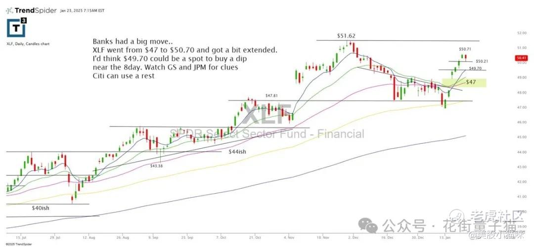 银行业表现强劲。XLF 从 $47 上涨至 $50.70,走势略显过度。我认为 $49.70 可能是接近 8 日均线时买入的好机会。观察 GS 和 JPM 的动向,Citi 或许需要稍作调整。