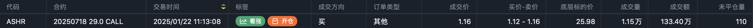 大单开仓2.1万手买入7月到期29看涨期权, $ASHR 20250718 29.0 CALL$ ,成交额大约240多万。