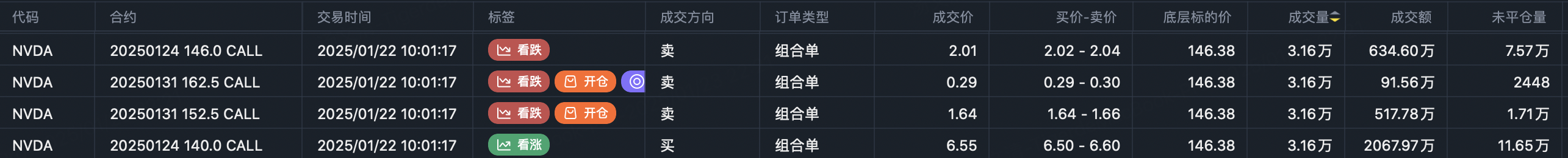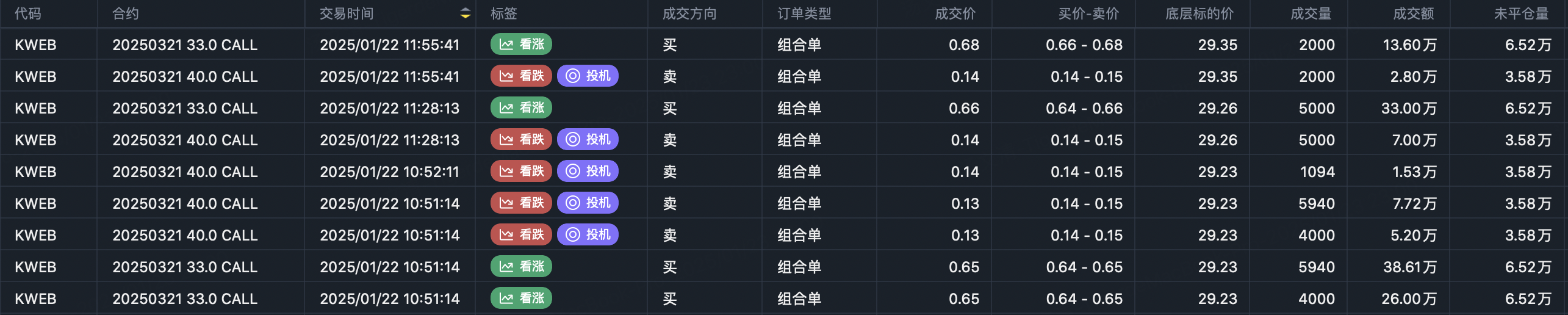 值得注意的是,还有一笔大单也选择了这个期权 $KWEB 20250321 33.0 CALL$ ,12月20日购入5万手,同时卖出37call $KWEB 20250321 37.0 CALL$ 。33call的成交额是575万。12月20日kweb股价29.5,今天1月23日股价29.2,股价变动不大,但时间损耗让这笔期权交易已经亏损约一半,不过机构尚未平仓。