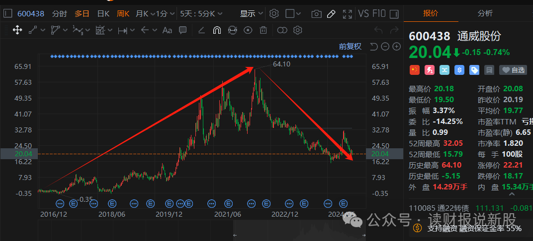 再看下通威的这个股价走势,从15年一路上涨到64块,2022年就是最后的高点