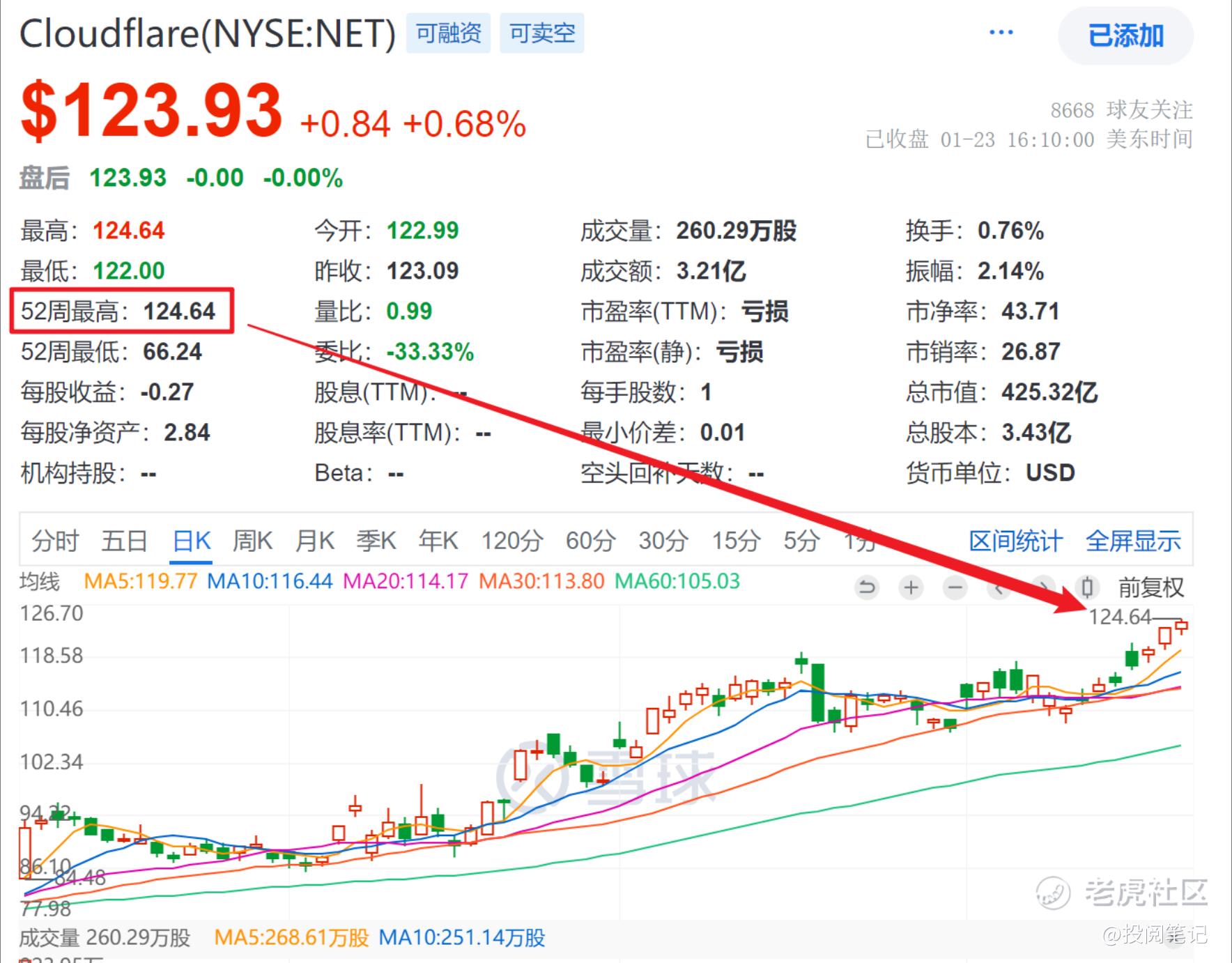 NET最新的股价创52周新高,市值为425.32亿,最新业绩公布时间是2025年2月6日盘后;