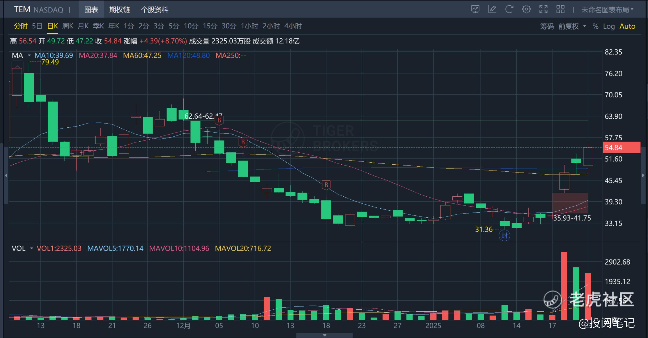 TEM上次市值为50.92亿,这次市值为86.34亿,相比上次公司市值上升了30.42亿美元,市值增长了60%,这次市值出现了巨大增长,主要是“国会山股神”南希·佩洛西购买了50份Tempus AI 的看涨期权。