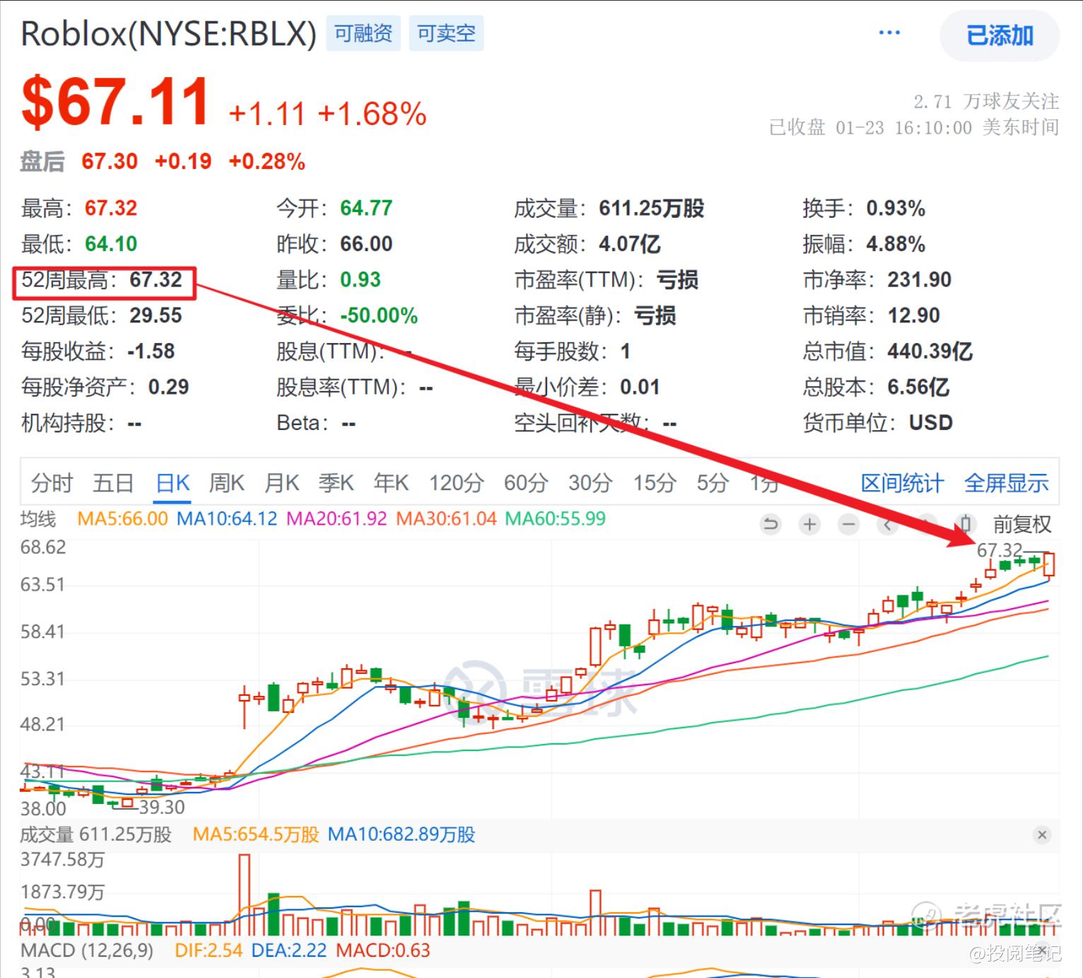 RBLX最新的股价创52周新高,市值为440.39亿,最新业绩公布时间是2025年2月6日盘前;