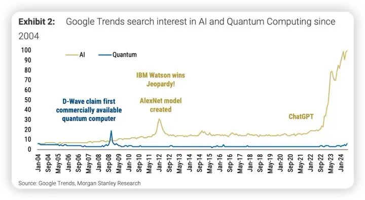 量子计算被一些人寄予厚望,部分评论认为,英伟达们遭遇了降维打击。但黄仁勋和扎克伯格在采访时泼冷水,认为距离其大规模商业化还需要相当一段时间。细节是,谷歌推出量子计算后股价大涨,而黄仁勋和扎克伯格发表评论后股价并未下跌,反倒是量子计算的小盘妖股跟随情绪暴涨暴跌,看来没有出现踩踏的传递。尽管量子计算引发了广泛讨论,但其实际发展状况仍处于早期阶段。投资者对量子计算的关注度虽有上升,但远低于人工智能领域。公众对量子计算的搜索兴趣有所增加,但与ai相比仍较低。企业在财报和文件中提及量子计算的频率有所上升,但总量仍然较低。目前投资者不易过早抢跑。
