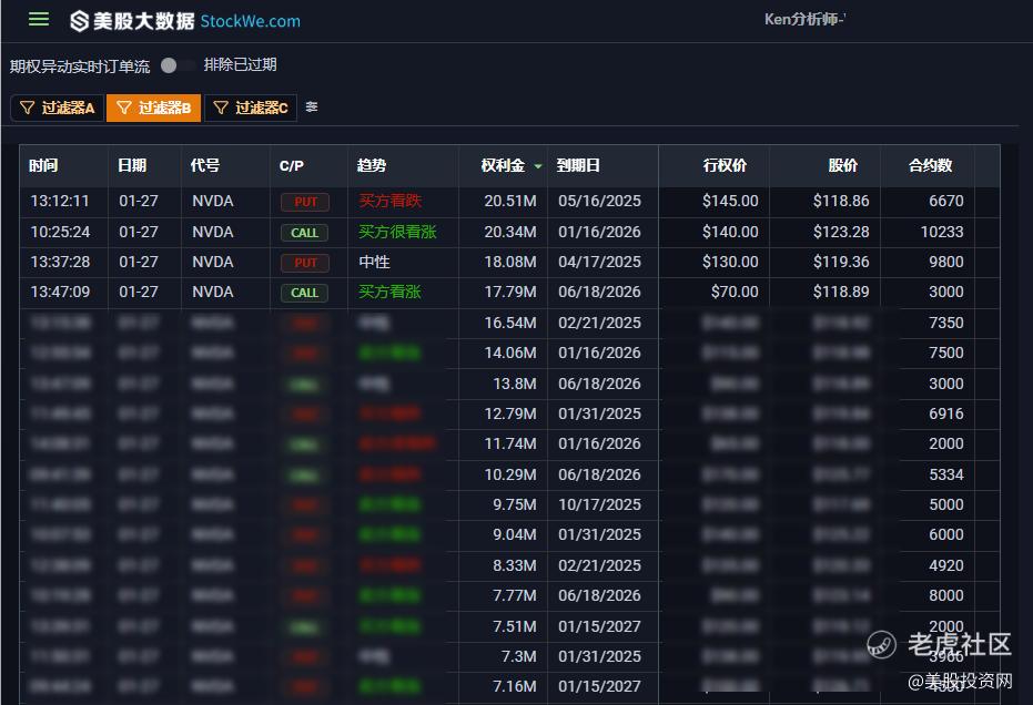 英伟达一开盘就出现大量的看跌趋势的期权,包括买Put和卖Call