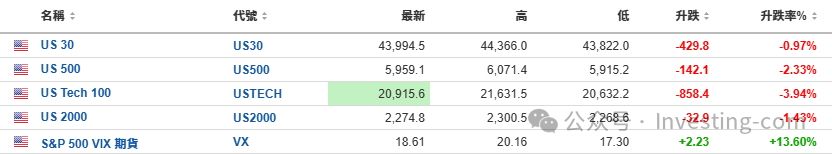 周一开市前,纳斯达克100指数期货跌幅一度达4%,标普500指数期货亦下滑2%。欧洲市场,科技股领跌,阿斯麦控股(AS:ASML)跌幅超10%。同时,市场波动率急剧上升,VIX恐慌指数飙升13%。