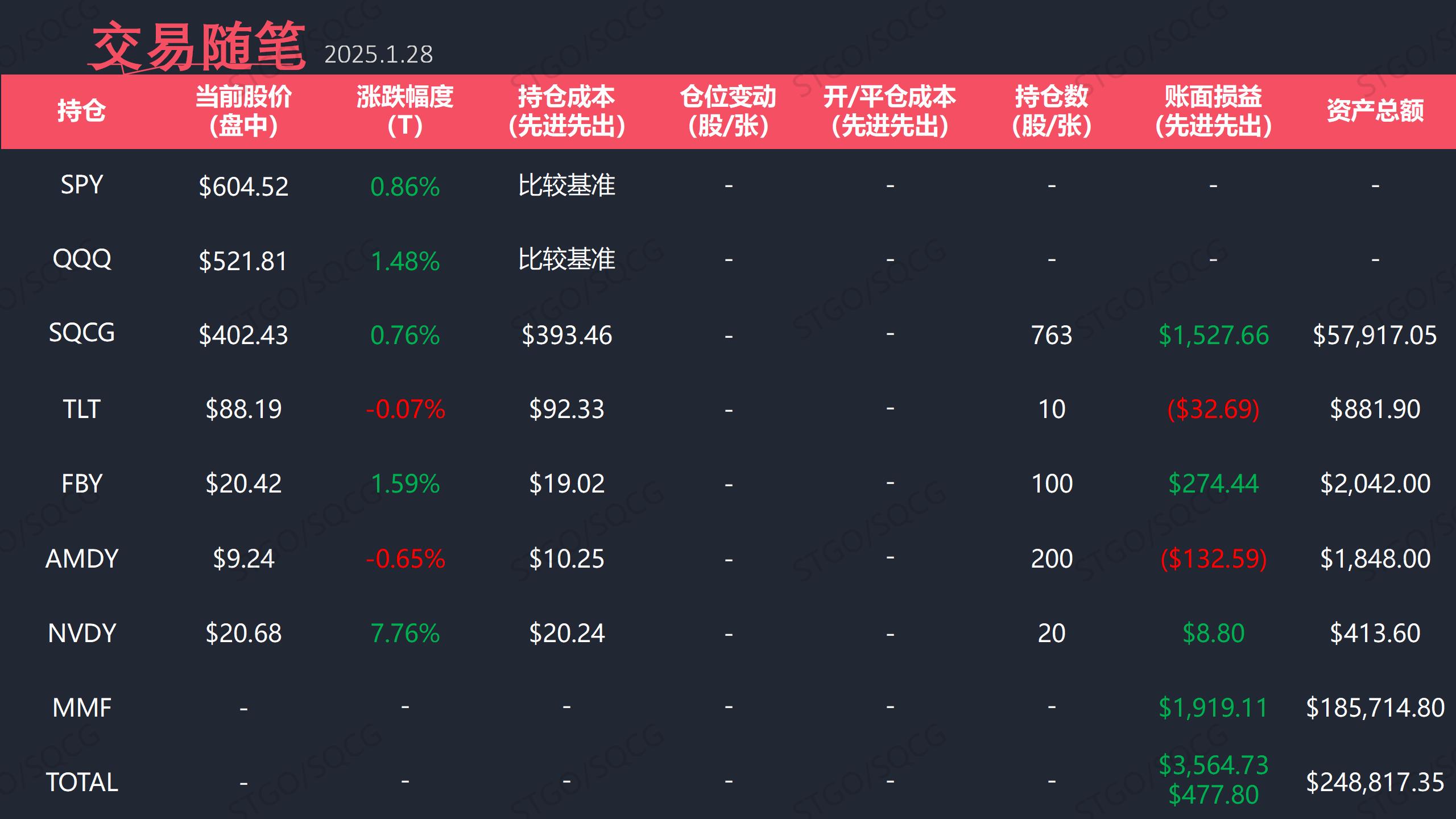 1、SPY/QQQ全线反弹,SQCG+0.76%,表现不及大盘。主要资金受到大科技上涨的感召,从其他标的流出,导致我们的等权ETF标的表现不佳。但是这部分表现不佳的损失会通过下跌的防守和未来的股息弥补。
