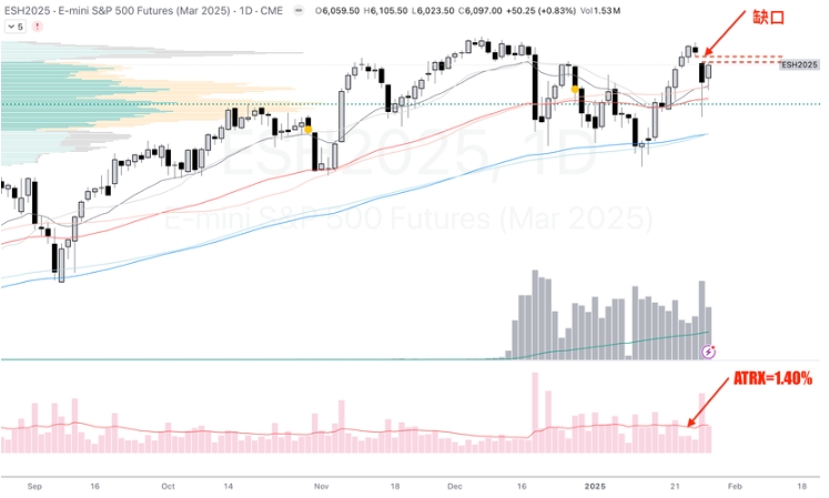 ②根据ATRX指标显示,最近ES的日均波动率是1.40%,也就是说,以今天的收盘价计算,明天上涨至6175、下跌至6005都属于正常波动范围。也即,明天即可以创出历史新高,也有可能是一段中期下跌的开始。