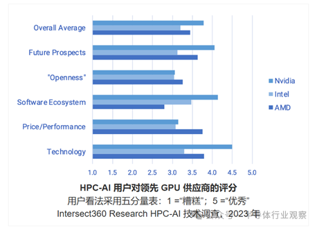AMD 的弱点是软件生态系统。在 2023 年 Intersect360 Research 的一项调查中,HPC-AI 用户认为 AMD 在 GPU 的性价比方面优于 Nvidia 和 Intel。但在软件生态系统方面,Nvidia 击败了 Intel,尤其是 AMD。(见图表。)Nvidia 还在“技术”和“未来前景”方面领先所有用户评分。