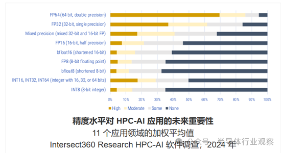 关于精度的某些讨论可能对 HPC 有益。在某些情况下,可能会对一开始就不是很精确的模型进行非常昂贵的高精度计算。但在 2024 年 Intersect360 Research 对 HPC-AI 软件的调查中,用户明确指出 FP64 对他们未来的应用最为重要。(见图表。)