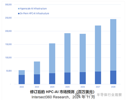 在我们 SC24 之前的网络研讨会上,Intersect360 Research 对其 2024 年 HPC-AI 市场预测进行了重大调整,宣布我们预计超大规模 AI 将连续第二年实现三位数增长,并且未来几年将保持高增长率。我们还提高了混合、本地(非超大规模)HPC-AI 市场的前景,但与超大规模的巨大增长相比,这种相对温和的增长显得微不足道。