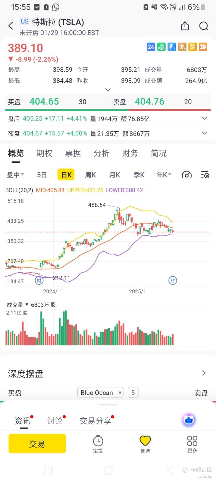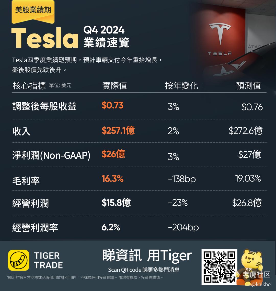 从目前的情况来看,特斯拉的股价在盘后大涨啊,大家看看老虎个股页面的这个盘后价,目前已经涨了17%,但这更多的可能是市场对其未来预期的过度反应。从这次财报的收入、利润、EPS、毛利率、核心汽车业务收入几个关键指标上看,样样都是不及预期,可以说真的是差的很全面 [捂脸]。在未来,随着市场竞争的加剧和自身问题的逐渐显现,特斯拉的股价很可能会面临下行压力,我对特斯拉的未来走势持看跌态度。