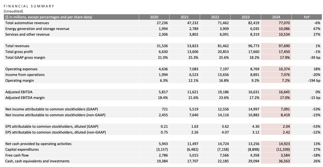 ● 特斯拉2024年全年营收为976.9亿美元(增长1%);