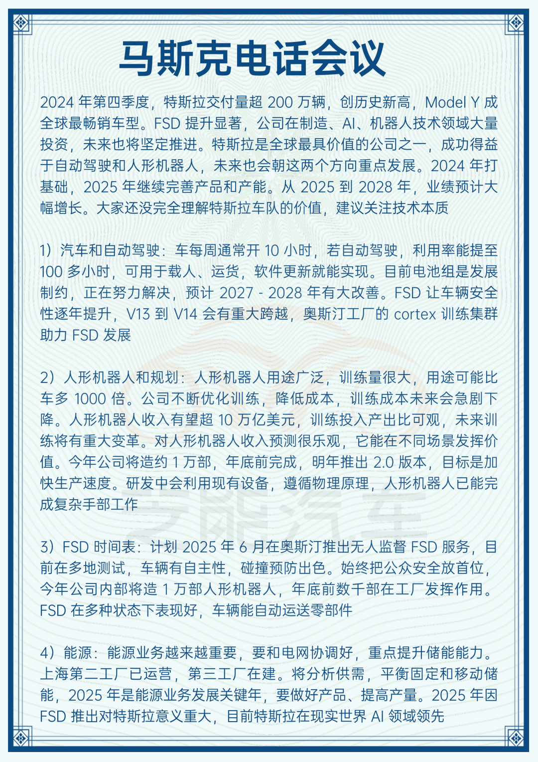 2024 年第四季度,特斯拉交付超 200 万辆,Model Y 全球最畅销。同年 FSD 进步大,在制造、AI、机器人技术有大量投资。特斯拉价值高,成功靠自动驾驶和人形机器人,未来继续朝这发展。