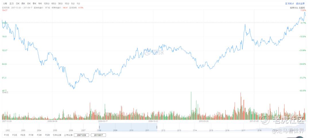 即便你不幸在2007年最高点买入,持有至今的回报也是不错的。而且你还可以考虑越跌越买,在下跌过程中买入来均摊降低买入成本。但是这么说是站在2个理想化的视角,第一是今天你知道他后来会大涨,你当然敢持续在下跌过程中买入,但是当时那样暴跌过程中很多人是没有这个胆量的。第二是你得确保自己随时有资金补仓,这就对你的资金要求比较高。