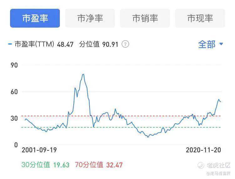 从市盈率历史数据来看,茅台上市以来,80%的时间市盈率都在20-30倍之间,只有2007年那波牛市行情把市盈率短暂推高到79倍,然后又迅速下滑到20倍下方。而2019年来,随着茅台股价不断走强,它的市盈率数据又来到了30倍以上,并逐步攀升到了今天48倍的历史次高位。