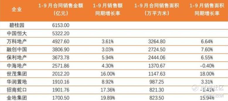 下面的表格是2020年前3季度中国房地产公司销售额排行: