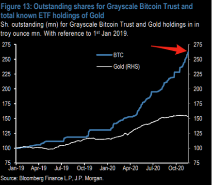 根据摩根大通的报告,美国数字货币投资机构Grayscale旗下的比特币信托Grayscale Bitcoin Trust近期份额快速增长。暗示比特币这一波大涨背后,那些将比特币视为长期投资工具的机构投资者起着比量化基金更大的作用。