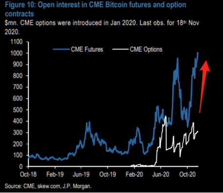 与此同时,芝加哥商品交易所(CME)未平仓比特币期货与期权合约快速飙升