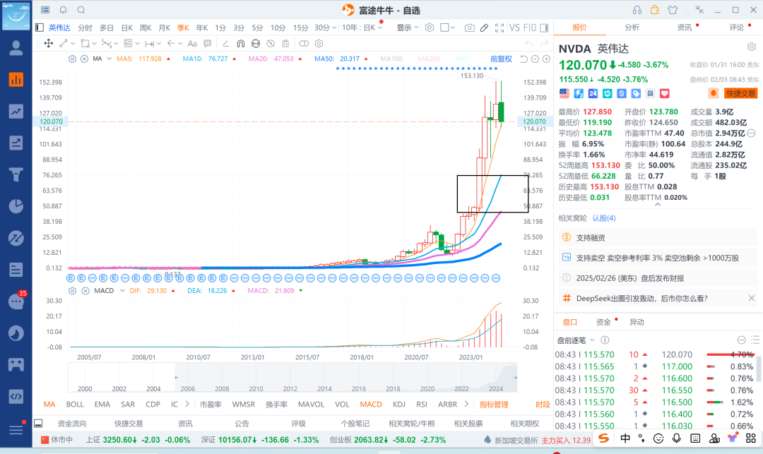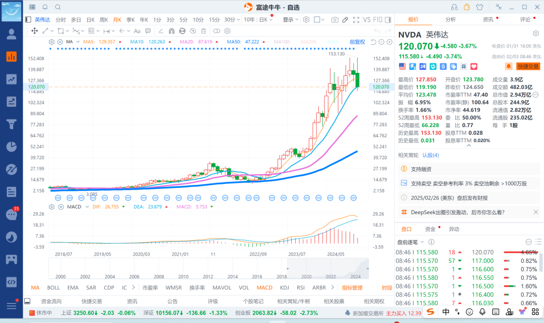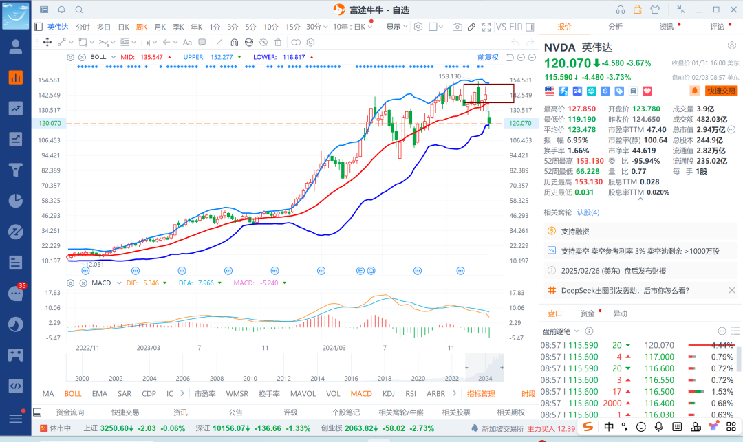 deepseek的巨大算法成功,打击了老美的ai体系,自然对英伟达也是利空了,至少短中是如此,长线的看ai的发展了,对英伟达的估值系统产生了影响,搞不好就完犊子一波呢,这个就是趋势的自我加强了,而且美股也开始弱了,就是没有完全完犊子罢了,这样就是网格化的做空就好了。