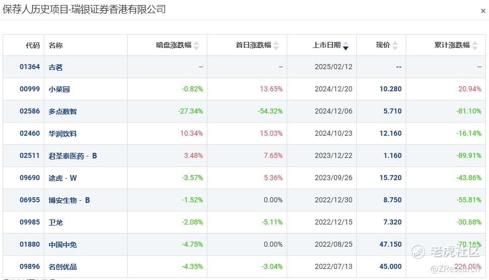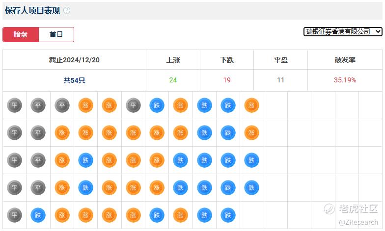 瑞银历史上作为保荐人参与了54个项目,其中暗盘有24家公司上涨,19家公司下跌,破发率35.19%。近两年共参与了5个项目,上市首日4家公司上涨,1家公司下跌。