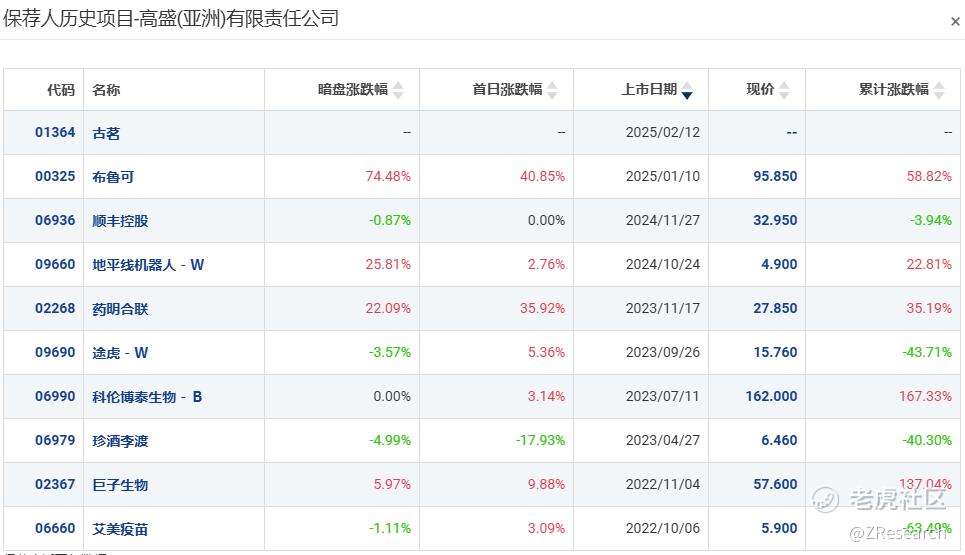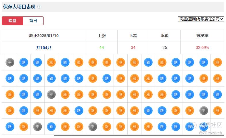高盛历史上作为保荐人参与了104个项目,其中暗盘有44家公司上涨,34家公司下跌,破发率32.69%。近两年共参与了7个项目,上市首日5家公司上涨,1家公司下跌,一家公司持平。