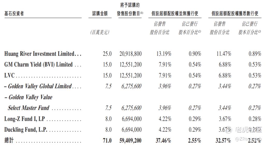 此次发行共引入5名基石投资者,其中,腾讯子公司Huang River认购2,500万美元,元生资本和正心谷资本分别认购1,500万美元,美团龙珠和Duckling Fund分别认购800万美元,累计认购7,100万美元。若按发行价中值9.31港元定价,基石占全球发售股份的股份约37.46%及全球发售完成后已发行股本总数的2.55%(假设超额配股权未获行使)。值得一提的是,Huang River也是老铺黄金的第一大基石,老铺黄金是去年新股中的大牛股,暗盘日最高涨幅67.90%,上市日最高涨幅86.67%,上市至今累计上涨超过10倍。