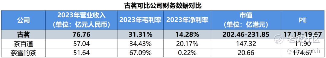 虽然古茗的市场份额比茶百道高0.9%,但毛利率和净利率均落后于茶百道。按2023年净利润计算,古茗的PE倍数区间为17.18倍~19.67倍,明显高于茶百道的11.90倍PE,估值偏高。