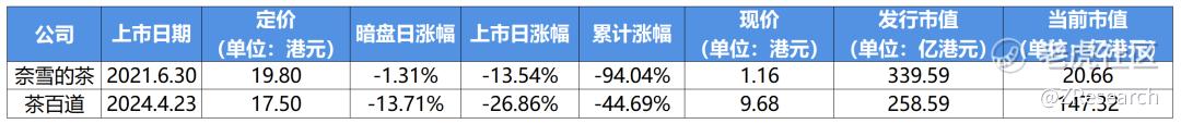 不过,根据历史经验,食品饮料行业新股上市破发率较高。目前港股已有两支奶茶类新股上市,分别是奈雪的茶和茶百道,上市首日均破发,股价一路下跌,市值大幅缩水,因此想要入手古茗的投资者还需认真衡量投资风险,谨慎投资。