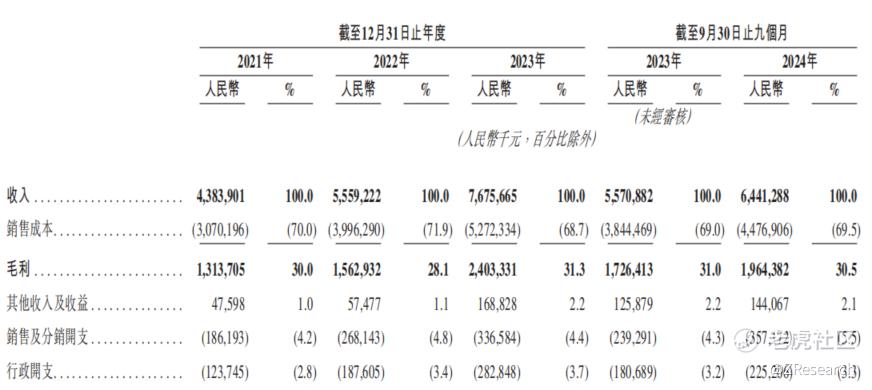 2021年、2022年、2023年及2024年前三个季度,古茗的营业收入分别为43.84亿、55.59亿、76.76亿和64.41亿元,2022年、2023年及2024年前三个季度同比增长率分别为26.81%、38.07%、15.62%。古茗的收入主要来自向加盟商销售货品及设备以及提供加盟管理服务,2024年前三季度占总收入的比重为99.8%。2021年、2022年、2023年及2024年前三个季度,古茗的毛利率分别为29.97%、28.11%、31.31%、30.50%,净利润分别为0.24亿、3.72亿、10.96亿和11.20亿元,净利率分别为0.55%、6.69%、14.28%、17.38%。