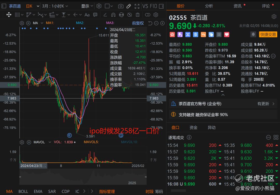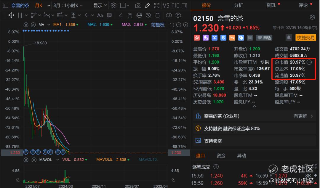 茶百道的跌幅也一度超过70%,还好后续股价有所回升,但跌幅仍超过40%。奈雪的茶在港股上市至今的跌幅已超过90%,奈雪现在跌得只剩下20亿了。之前两个上市的茶饮股都表现不佳。