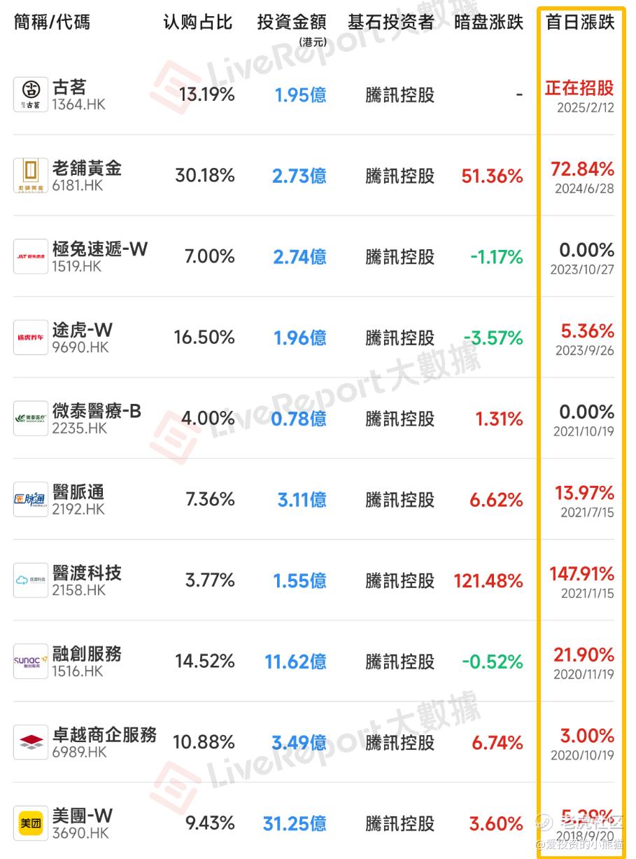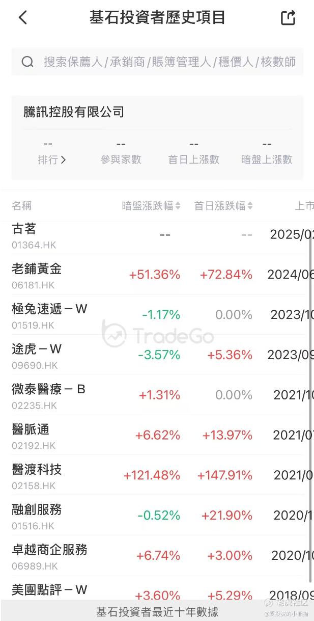 这票唯一的亮点就是基石是腾讯,由腾讯控股全资拥有的Huang River Investment Limited,认购2500万美元(约1.95亿港元),从历史的角度看,腾讯投基石的新股首日都有涨,这也是这个票的唯一亮点了,当然这个票是继续创造历史,还是说打破历史,那现在也不得而知。