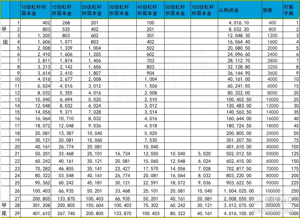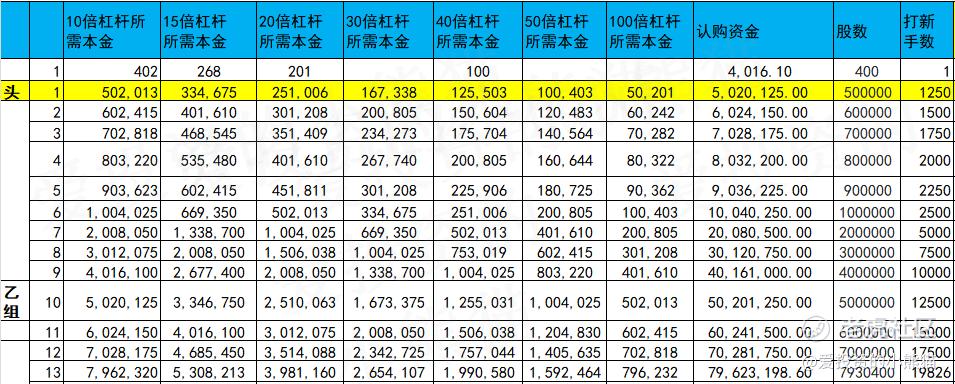 甲组的各档融资所需要的本金还有融资金额对应如下表: