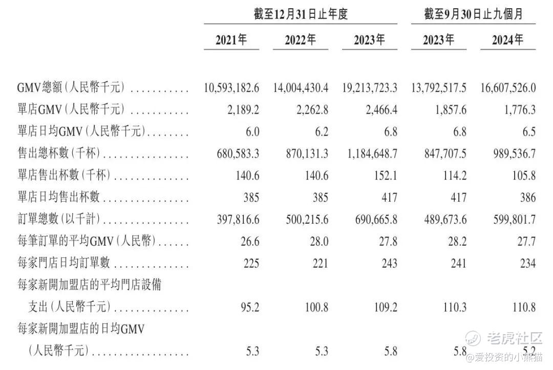 根据招股书披露,2024年前9个月,公司单店GMV为177.6万元,相较上年同比减少4.38%;同期单店售出杯数10.58万杯,同比减少7.36%;每笔订单的平均GMV为27.7元,同比减少1.77%;每家门店的日均订单数为234单,同比减少2.9%。