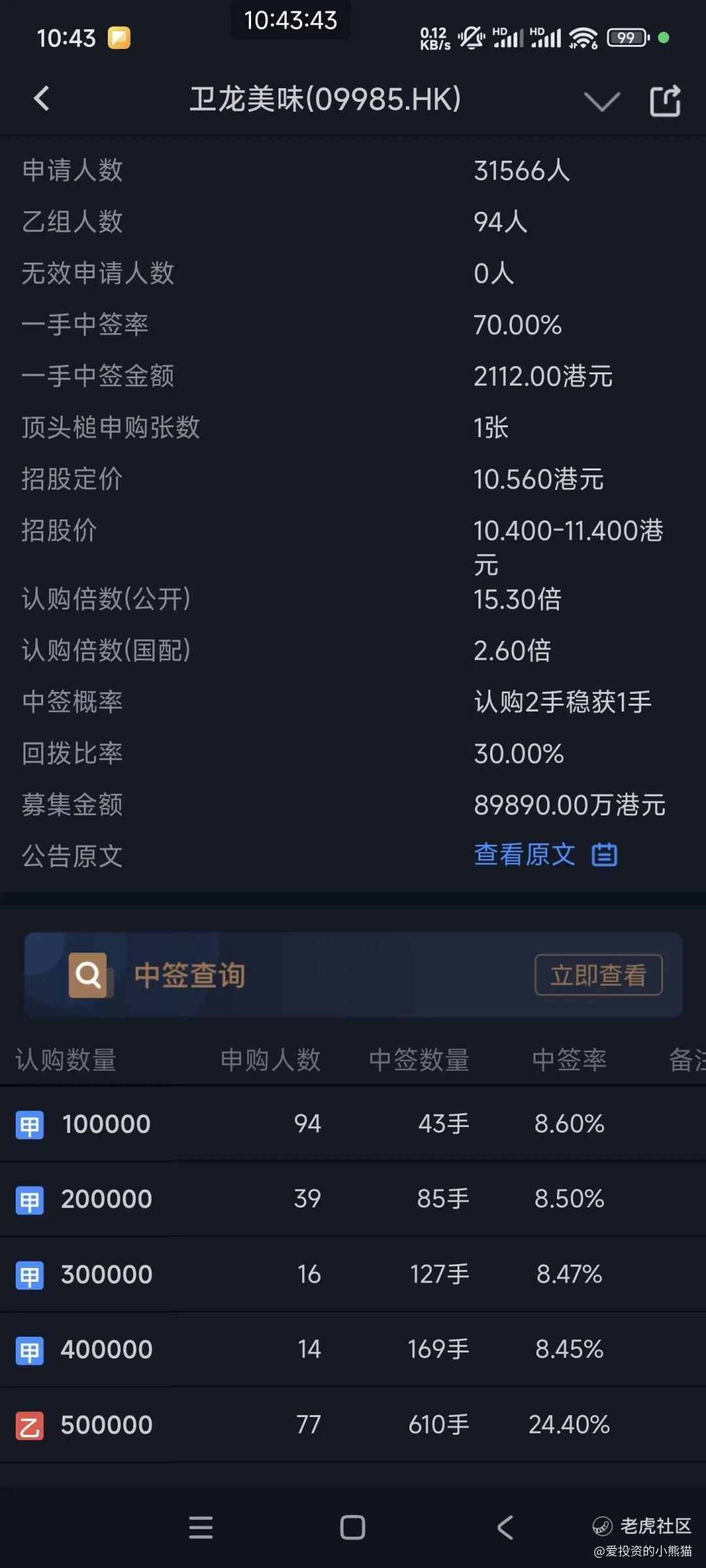 关于一手中签率方面,如果孖展在15倍以上,按照4人来参与预估一下,一手中签率90%,融资打新的话中签率可以参考之前卫龙辣条, 卫龙也是15倍刚刚好回拨,估计古茗这次有可能也是回拨30%,不过古茗的募资规模比卫龙大了1/2,从目前的孖展倍数来看,乙组中签率可能会很高。