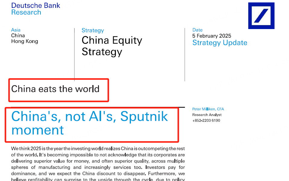 值得关注的一点是,德银将中国在电动汽车和人工智能领域的地位比作Sputnik Moment(形容某个事件促使国家或企业紧急调整战略,激发创新和竞争力提升的关键时刻)。🔥