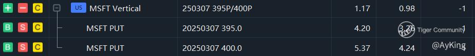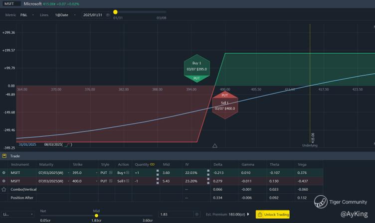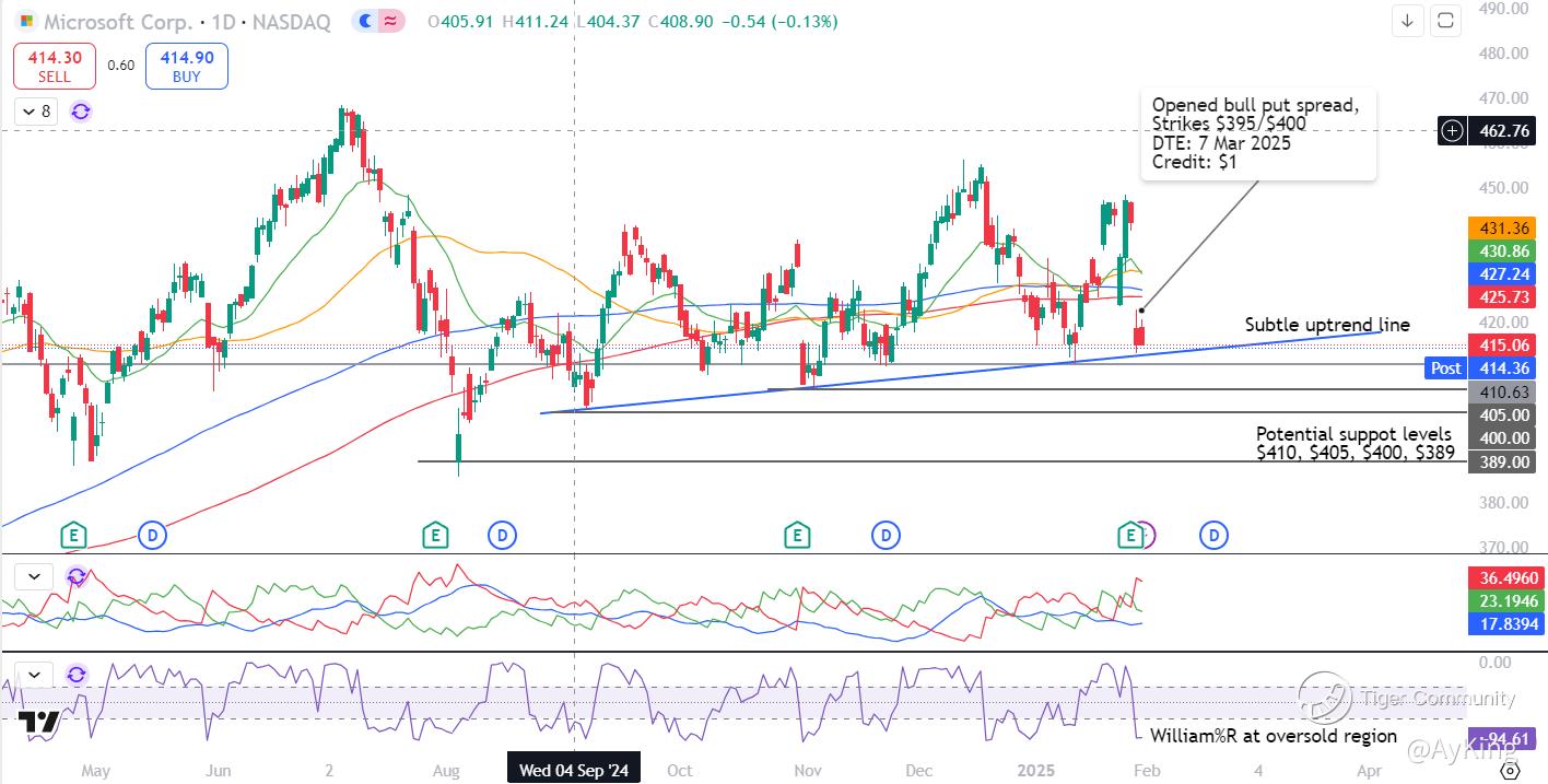 On 1 Feb, I did a technical analysis and have the outlook that $Microsoft(MSFT)$ stock price is near the bottom of the uptrend trendline and potentially may stay above $400 before 7 Mar 2025. Therefore, I have opened a Bull Put Spread with strikes $395/$400, date of expiry 7 Mar 2025, for credit of $0.98. I’ll get to keep the credit if price stays above $400 on 7 Mar 2025. The total risk of this trade is $4.02 ($5 spread – $0.98 credit received), which is approx. 1% of my total capital.