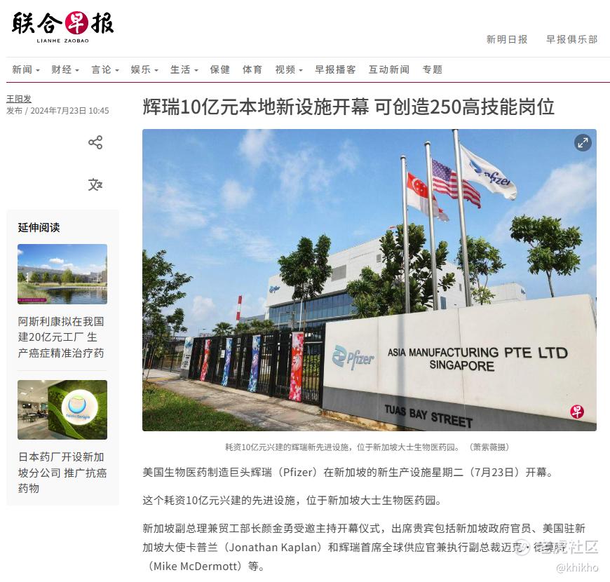 上次 $辉瑞(PFE)$ 上本地新闻,还是去年7月宣布在新加坡建立世界级生产基地,协助在新加坡造就一个强大而充满活力的生物医药制造生态系统。全球十大生物药剂公司已有七家在新加坡设厂。辉瑞多年来在新加坡扩充,是目前对新加坡生物医药行业贡献最大的公司之一。