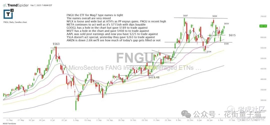 FNGU是针对Mag7类股的ETF,整体表现分化。NFLX表现松散,达到历史新高,FNGU刚刚创下新高,META继续表现良好,保持可买入。GOOGL有一个缺口并且给出189美元的交易机会,MSFT也有一个缺口,给出408美元的交易机会。AAPL在财报后被卖出,TSLA表现不佳,而AMZN下跌2.6%。我们将看到今天的缺口有多少被填补。